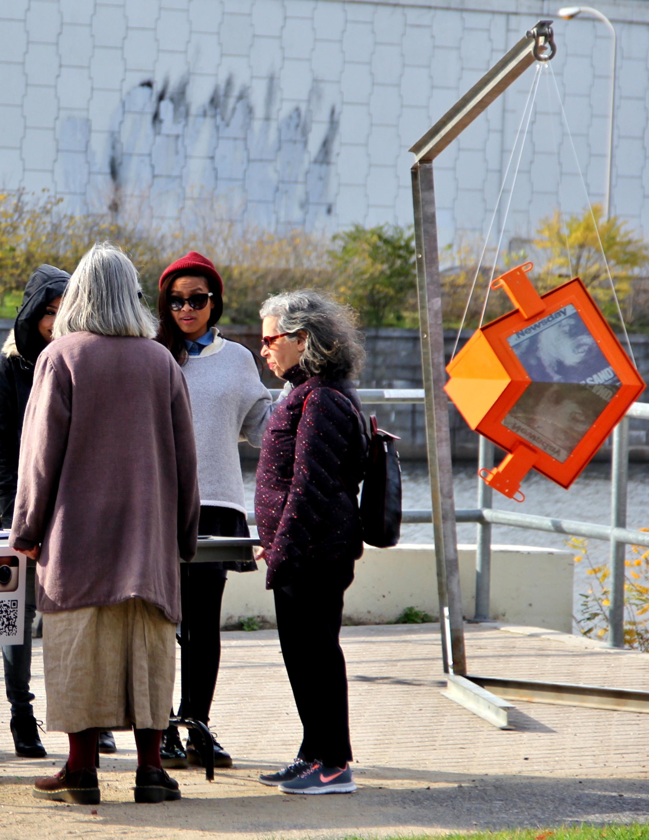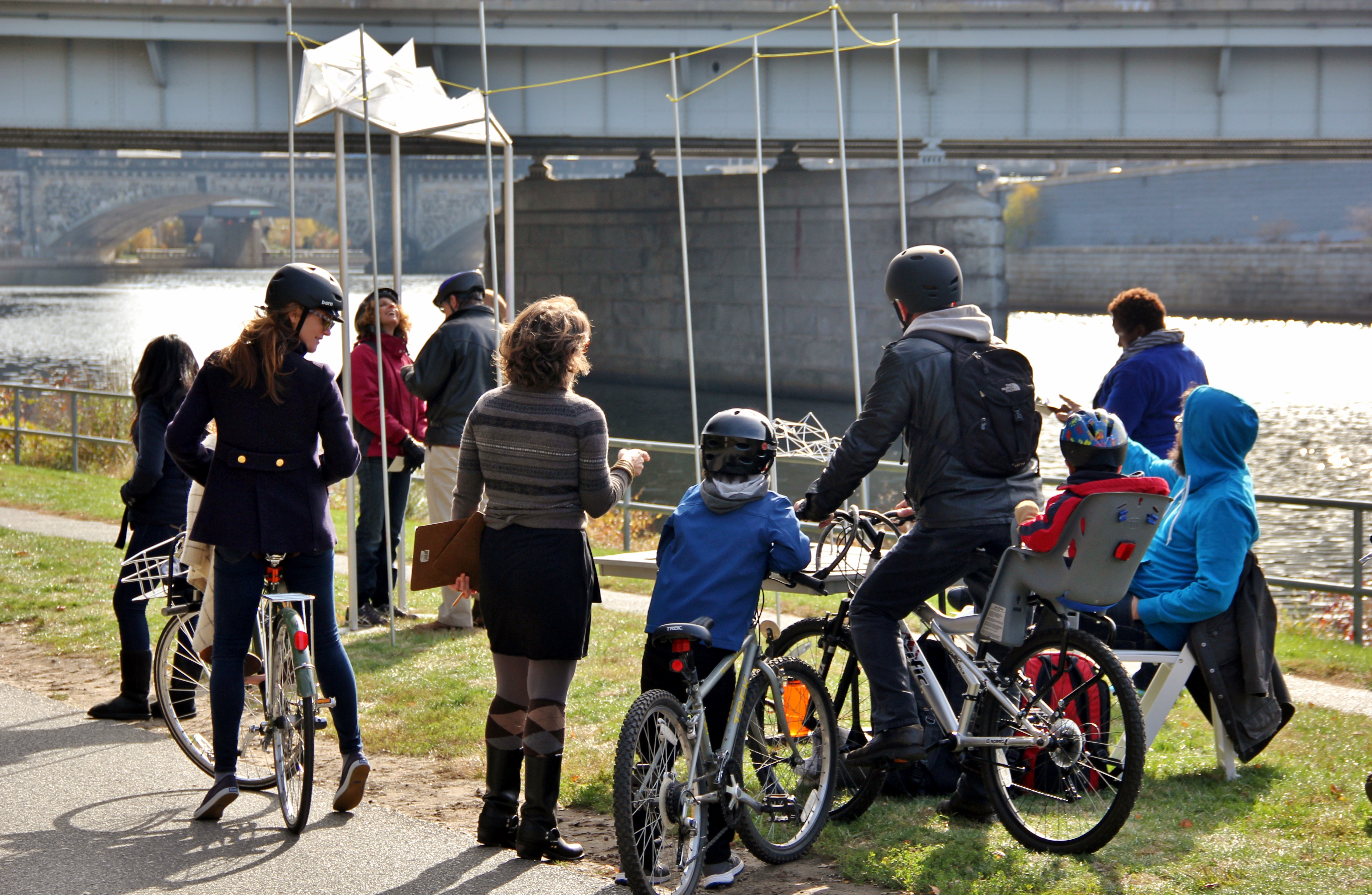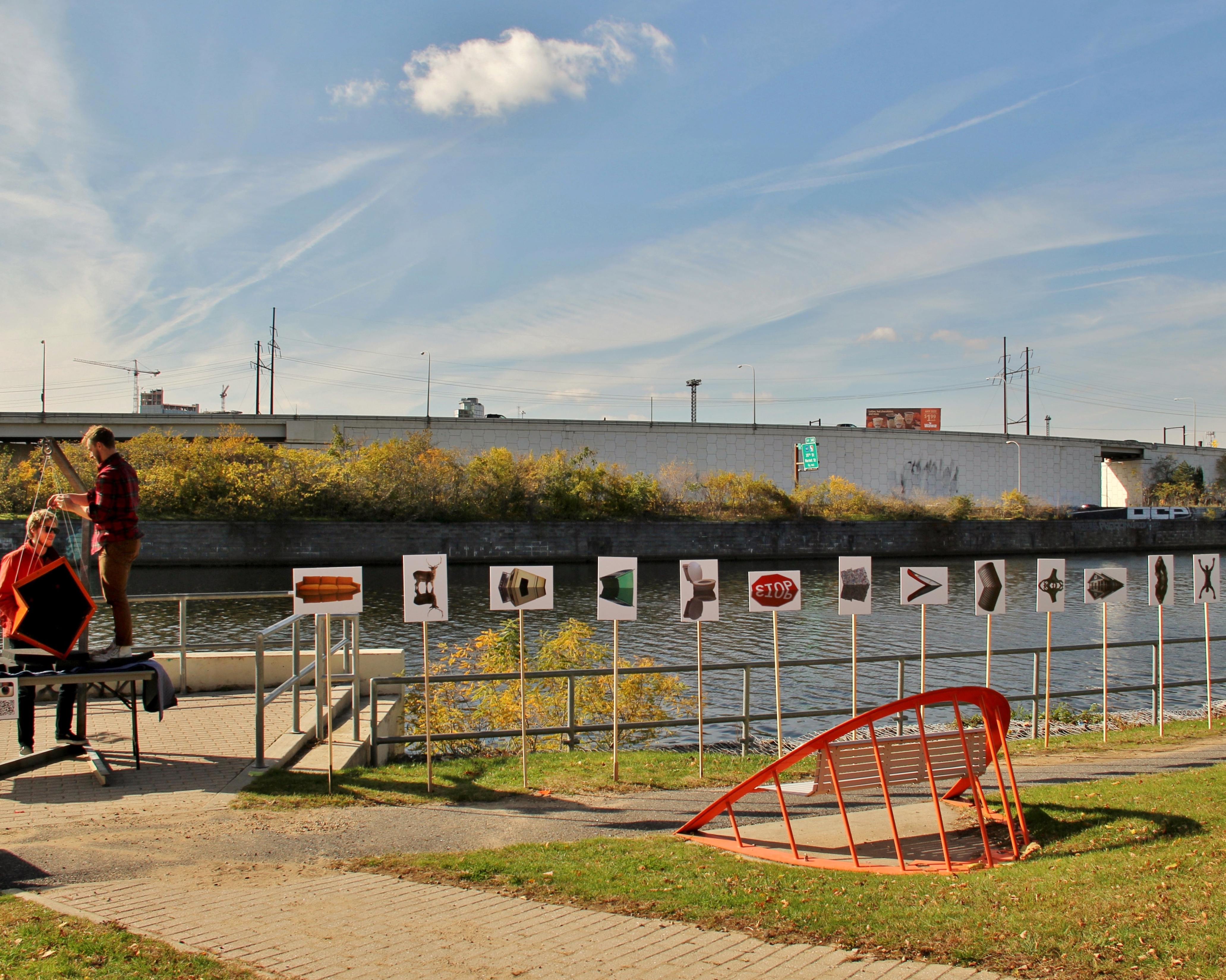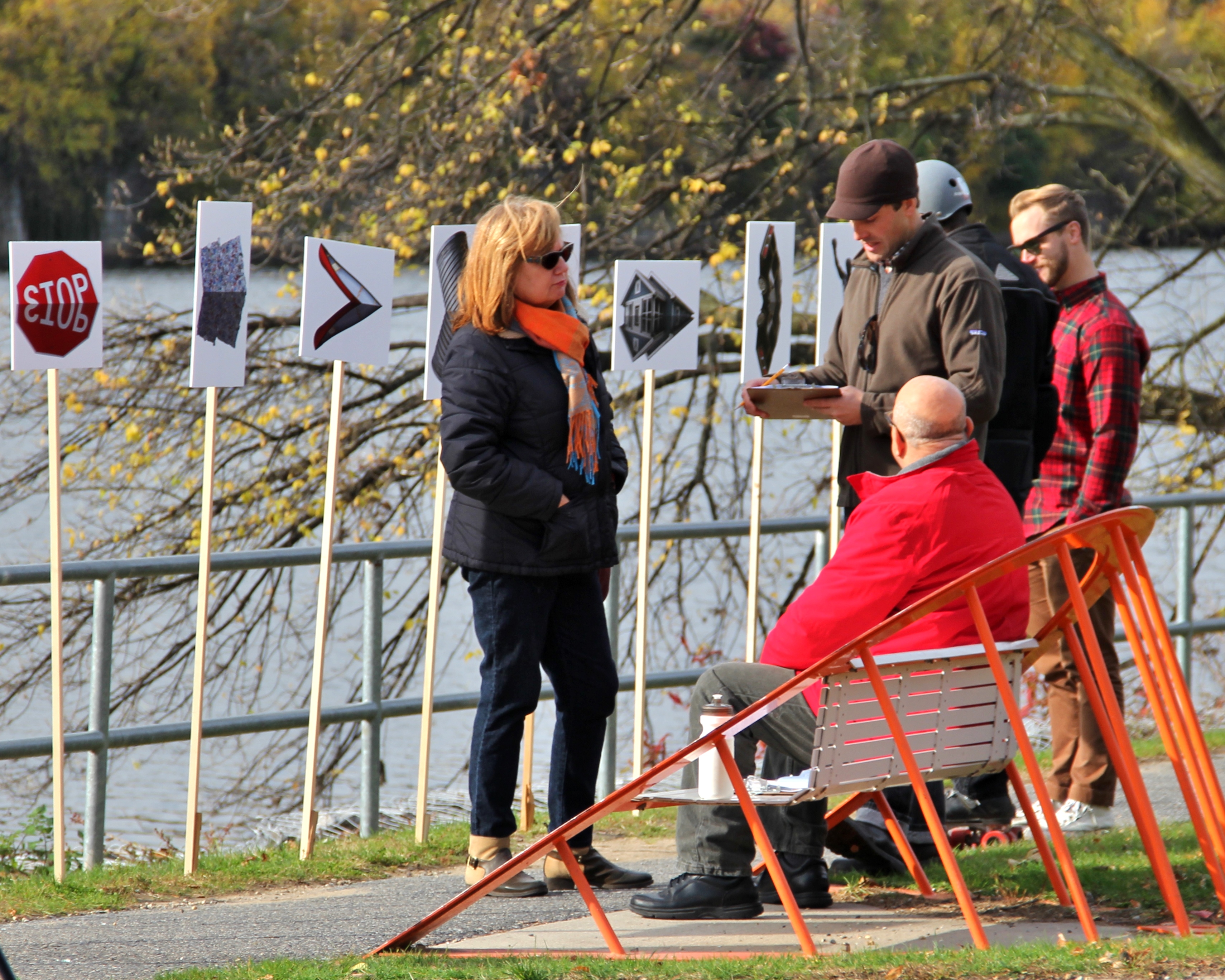 On Saturday, November 8, the Art on the Circuit Committee and FWW staff joined project finalists on the Schuylkill River Trail to get public feedback on prototypes of artist installations. The testing location was at mile marker 22 – just a south of Paine Park Skatepark. From about 12 noon until 3pm, more than one hundred passers-by were able to view and test out exhibits and ask questions of the artists. Here are a few photos from this public engagement session.