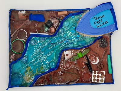 Each submission has a unique personality and perspective. Together, they showcase the diversity that makes our rivers, creeks, and streams special. The exhibit features an impressive range of media and materials, including paint, collage, pencil, wood, and yes: trash!